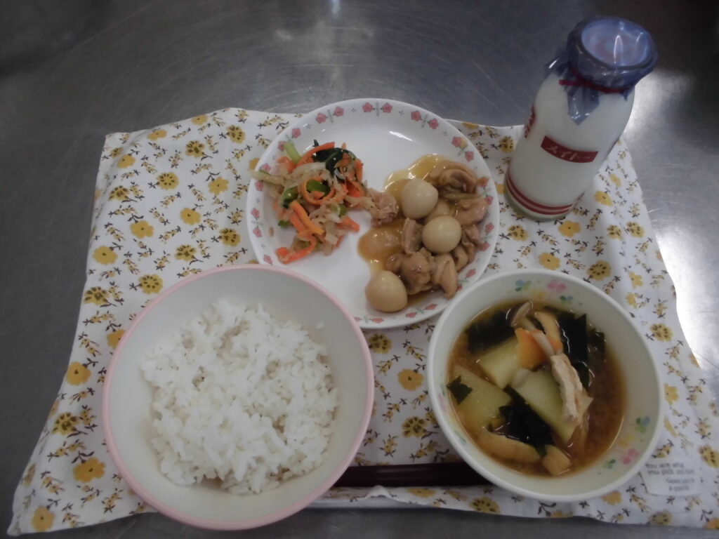 この日の給食は、麦ごはん・じゃがいものみそ汁・うずら卵の煮物・切り干し大根のサラダ・牛乳です。