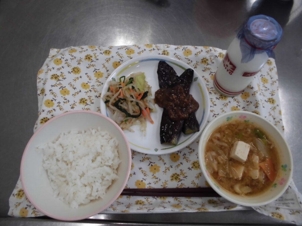 この日の給食は、麦ごはん・ごまみそキムチ汁・揚げナスの肉みそあんかけ・もやしのおひたし・牛乳です。