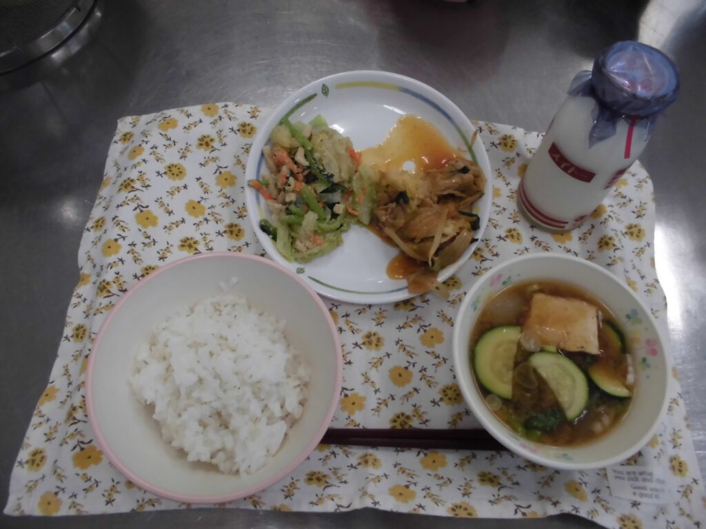 この日の給食は、麦ごはん・ズッキーニのみそ汁・豚キムチ炒め・凍り豆腐のごまあえ・牛乳です。