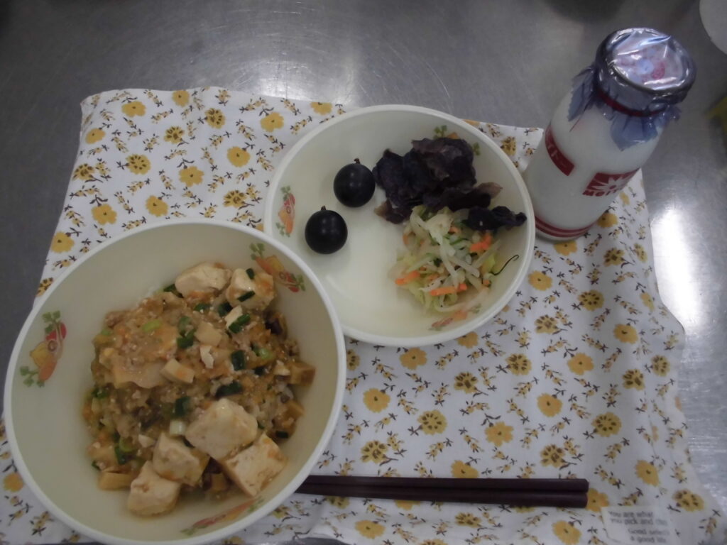 10/10の給食は、マーボ豆腐丼・チップスサラダ・巨峰・牛乳でした。