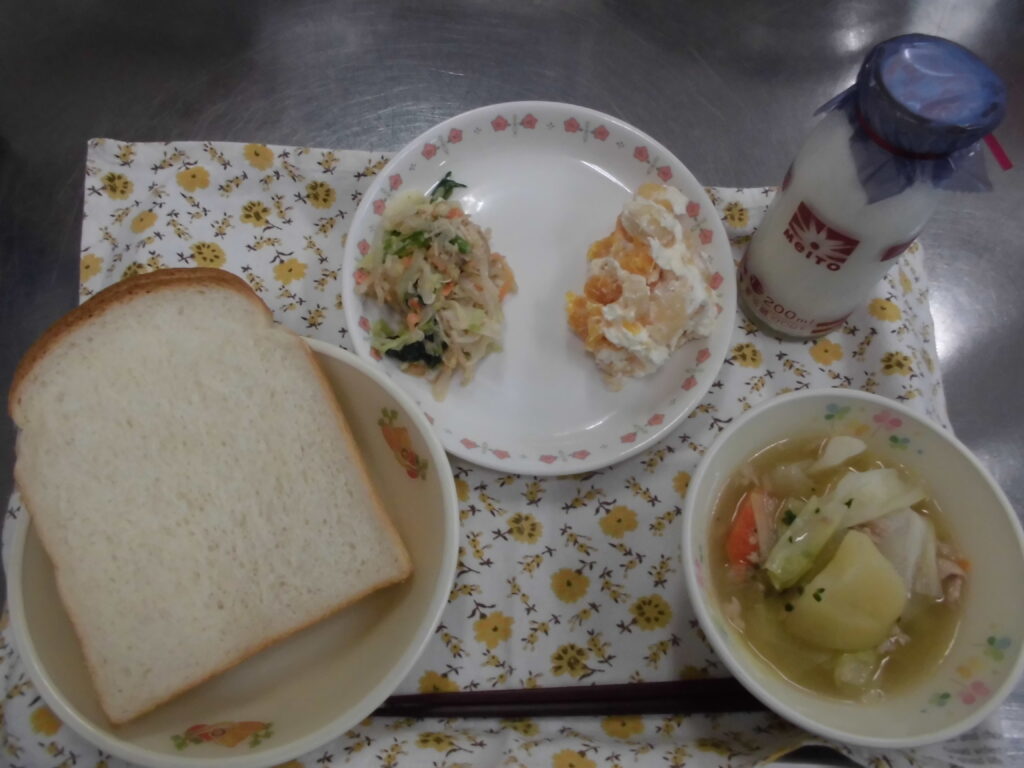 10/16の給食は、食パン・フルーツクリーム・ポトフ・蒸し鶏のごまサラダでした。