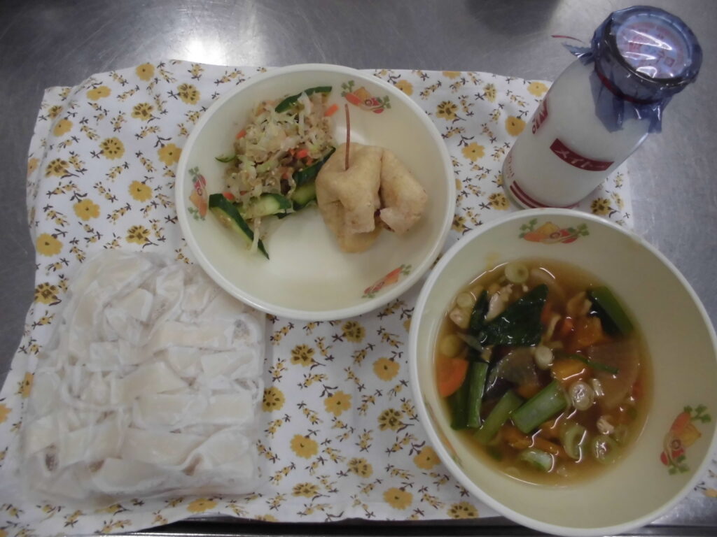 10/21の給食は、ほうとう・ほうとう汁・こんこんコロッケ・まぜっこサラダ・牛乳でした。