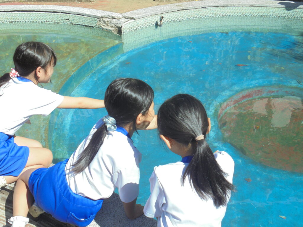 今年は春のPTA作業が雨天で中止となり、池の掃除ができなかったため、藻の量が多くて池の中の様子はほとんど見えない状況でした。しかし、先日行われた秋のPTA作業ですっかりときれいにしていただき、透き通った水面から池の魚の様子がよくわかります。