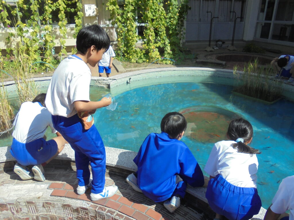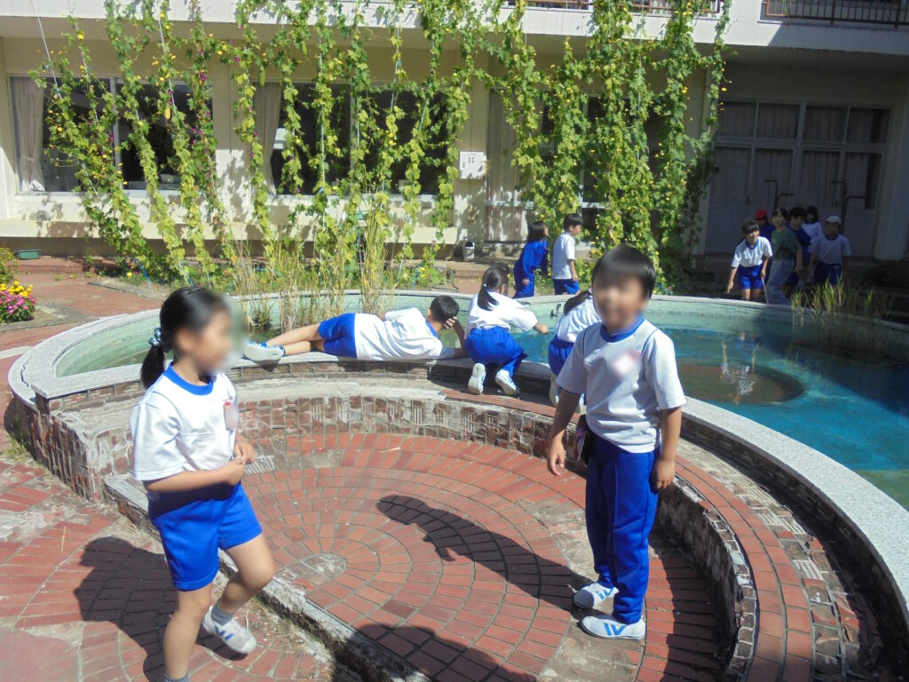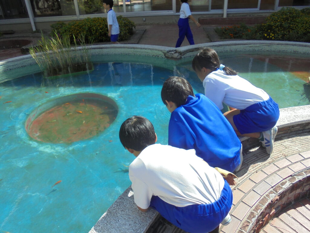休み時間のたびにここに来て、鬼ごっこをしたり、池の魚をながめたり、それぞれで楽しんでいます。