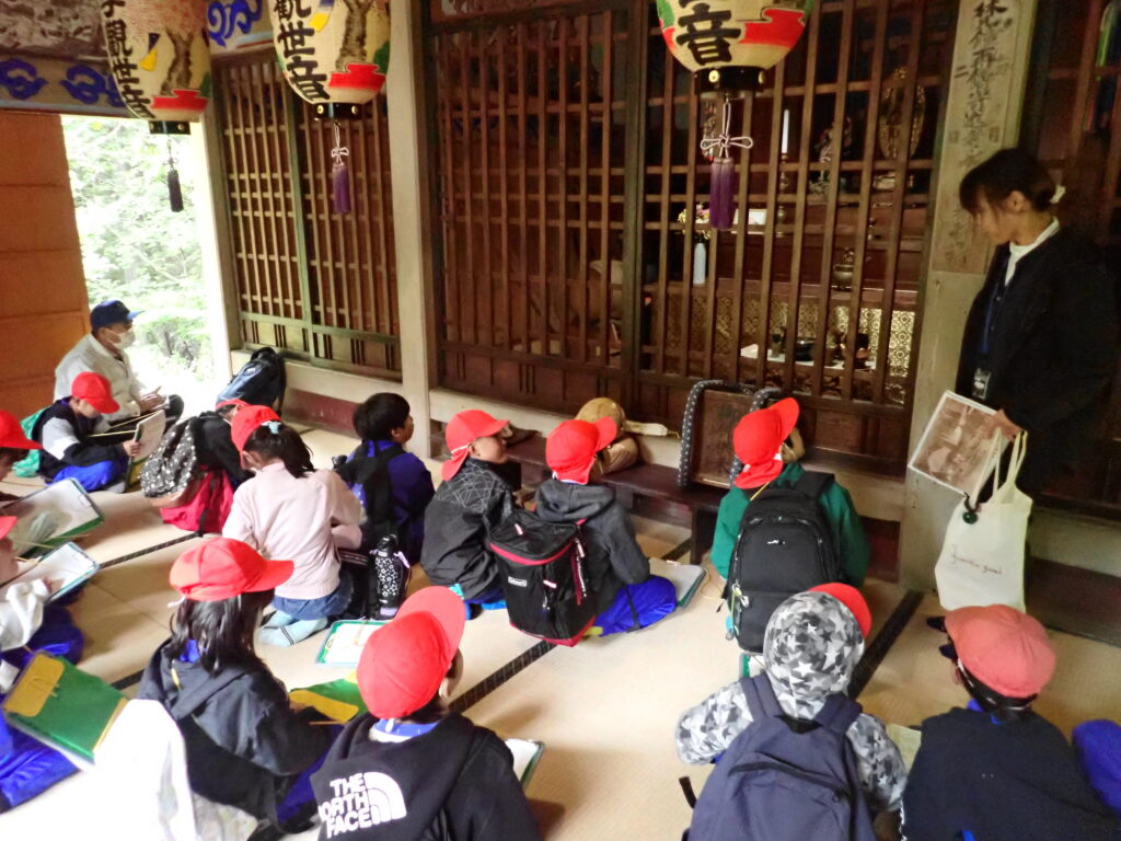 21日(火)に、清水寺見学に行ってきました。一学期に社会の授業で、地域探検を行ったときに、子どもたちから行きたいところとしてあがっていた清水寺に、ついに行ってくることができました。見学するにあたり、清水寺の管理人である岡上さんと、史談会の上條さんたちに説明をしていただきました。門やお堂、仏像などがいつごろ、どのように作られたのかなど、資料なども見せていただきながら、子どもたちに分かりやすく、楽しく学べるように工夫がされていました。お忙しい中、 子どもたちのためにご準備していただいたことに、本当に感謝です。