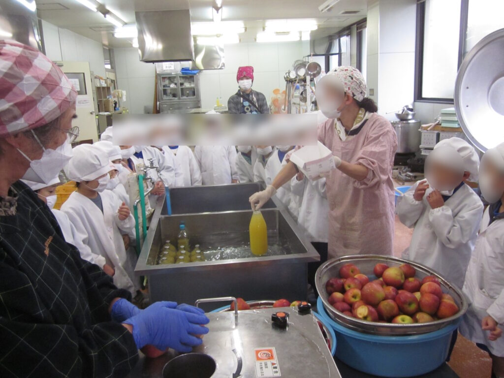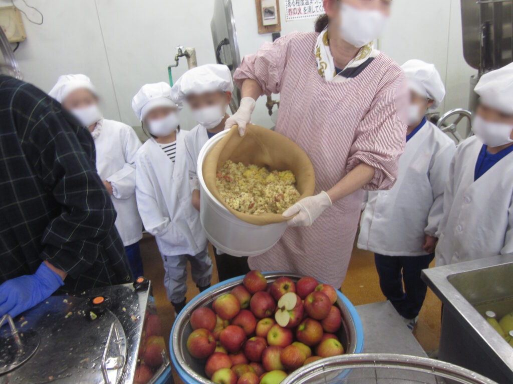 しぼりたてのりんごジュースを試飲させていただき、おいしい給食のひみつをまた一つさぐることができたようです。