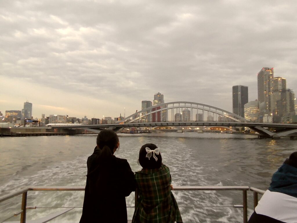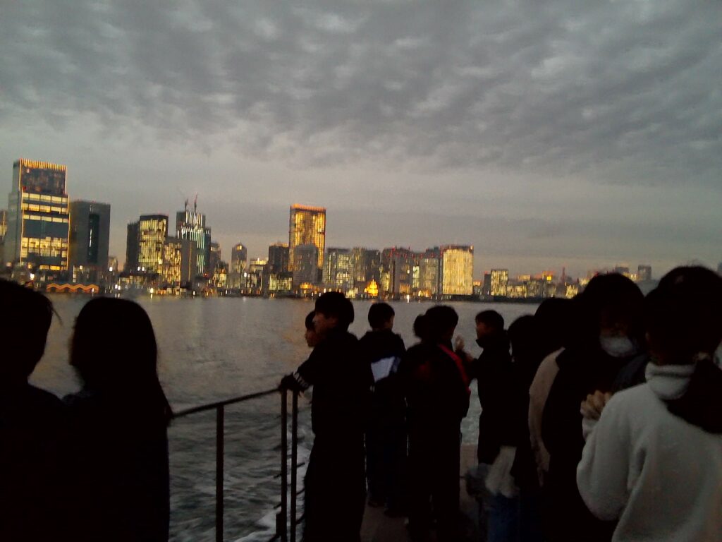 バスから浅草の町並みを興味深く眺めた後の体験は水上バス。全員元気で徐々に暗くなる水上からの東京の景色を存分に楽しむことができました。