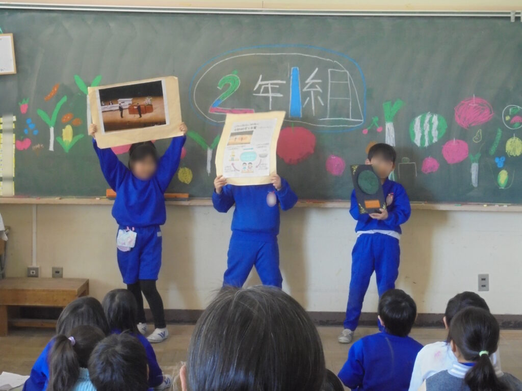 この一年間、生活科の学習で追究してきた「きゅうしょくのひみつ」。先日の参観日には、保護者や地域の皆さんに向けて発表を行いました。